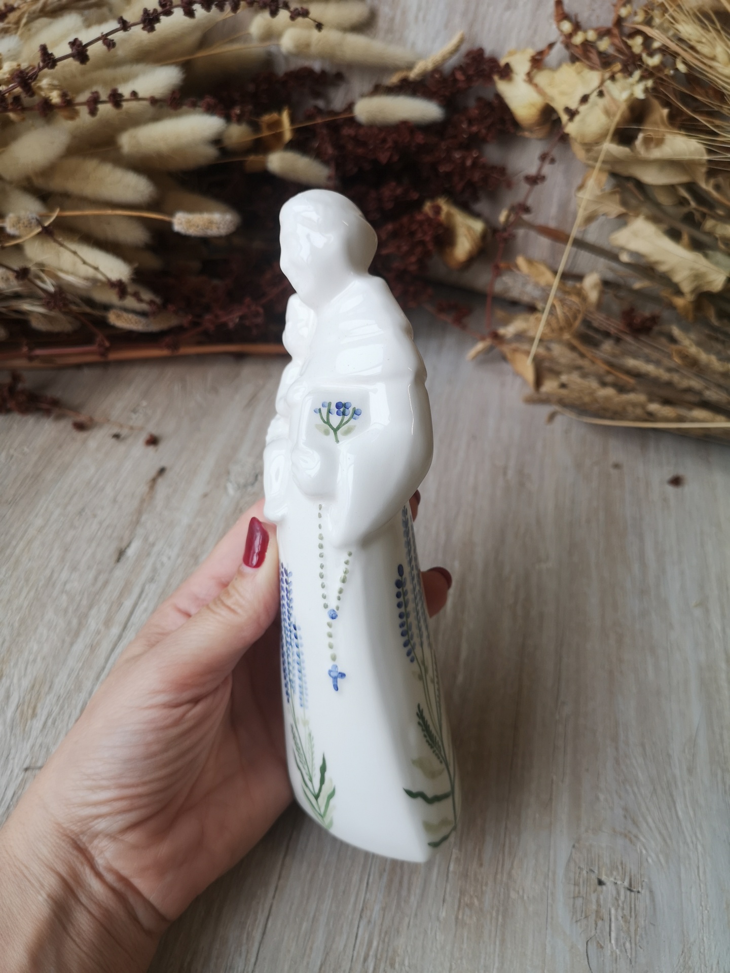 Figura religiosa de porcelana branca com pintura floral azul e verde e rosário azul, segurada por mão com unhas vermelhas.