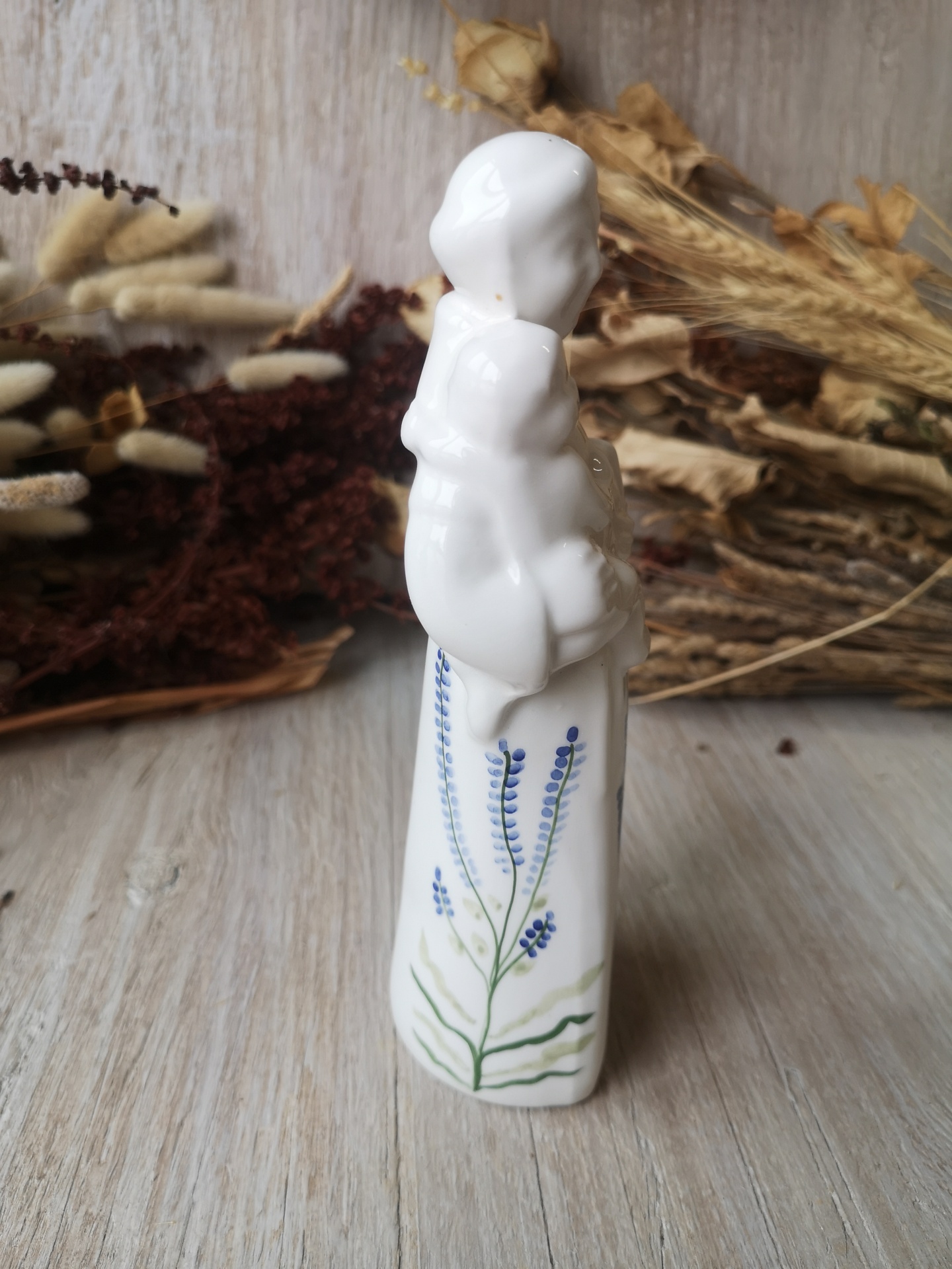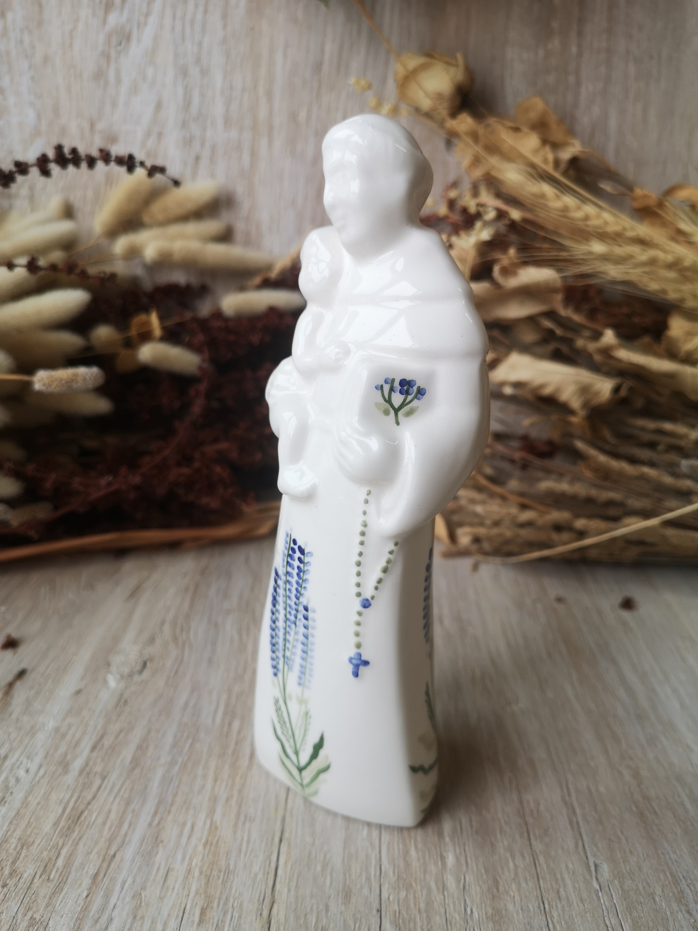 Estatueta de porcelana branca de santo com criança e flores azuis decorativas