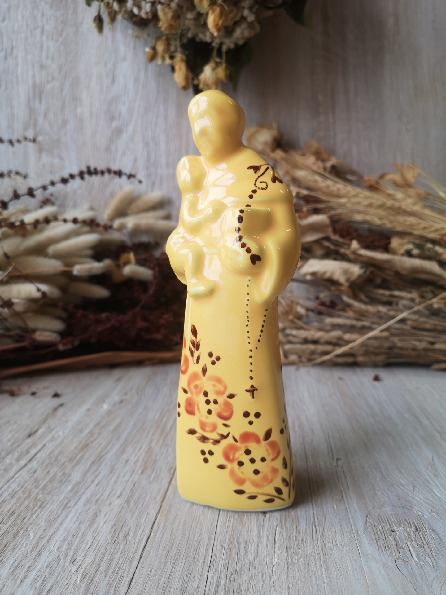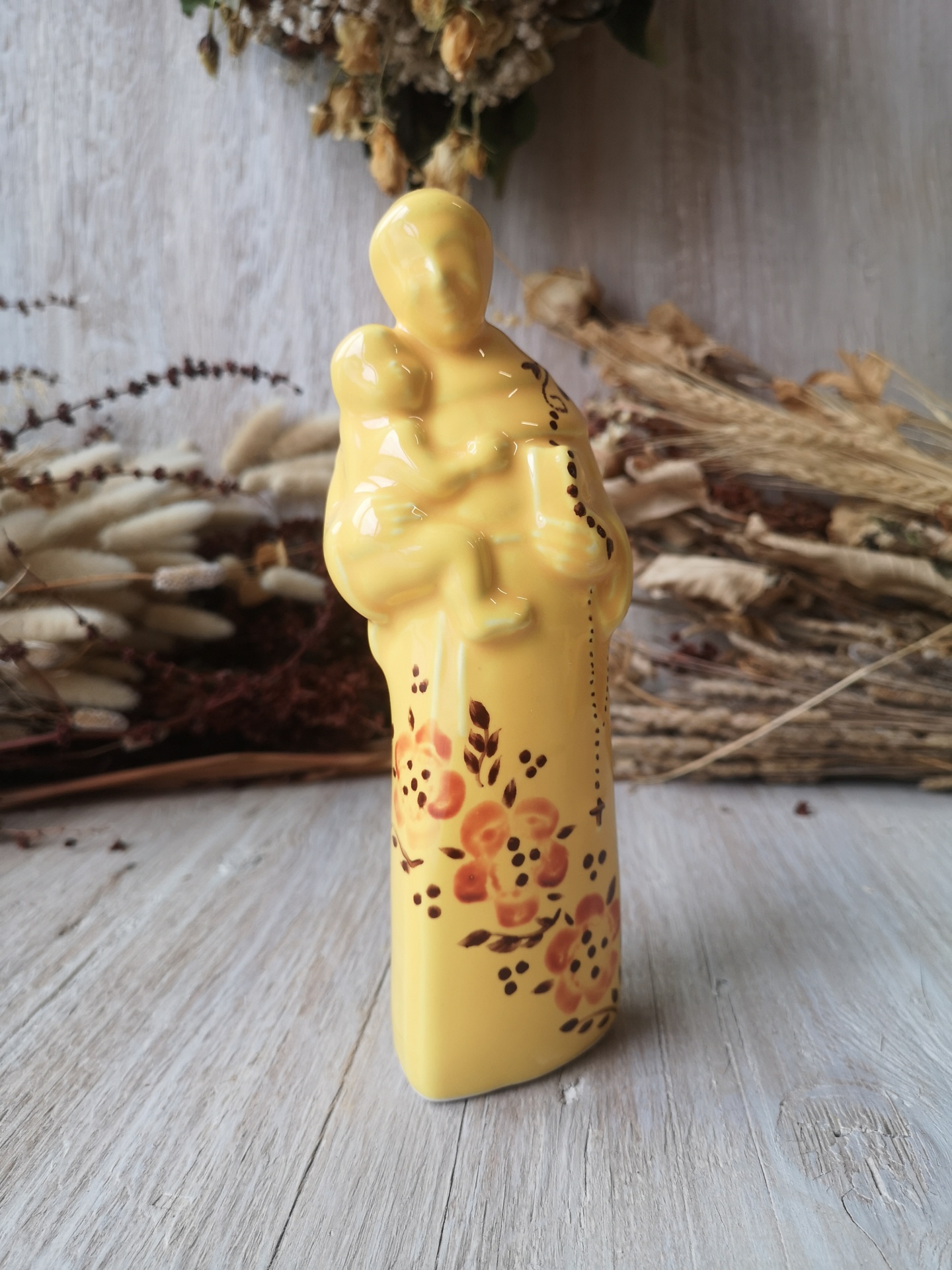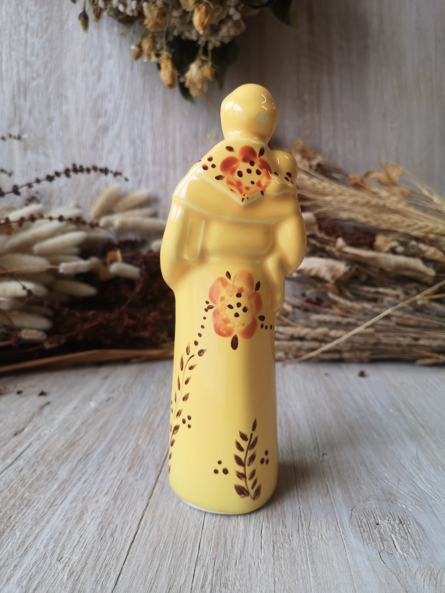 Estatueta cerâmica amarela de figura religiosa com criança e flores decorativas