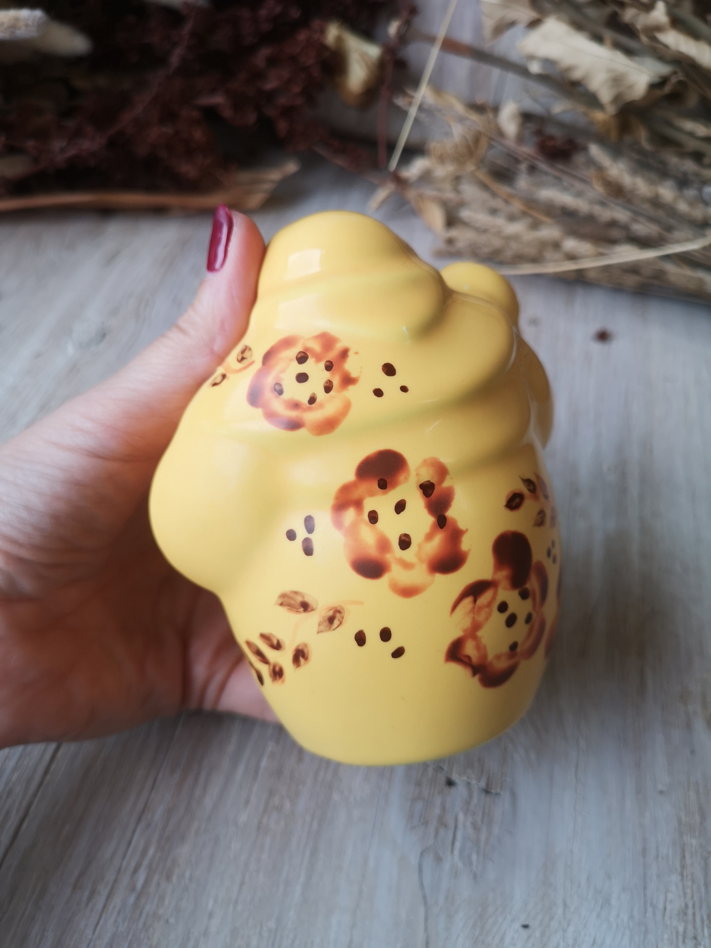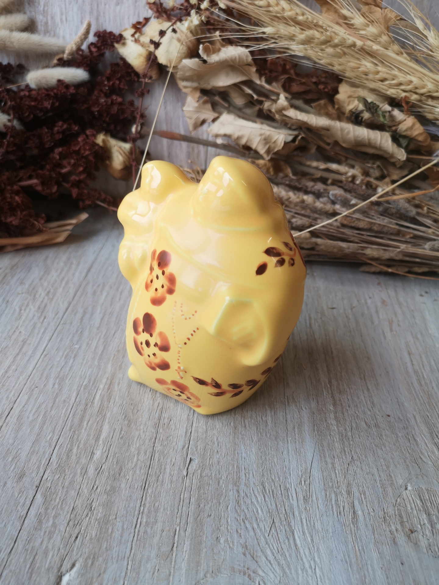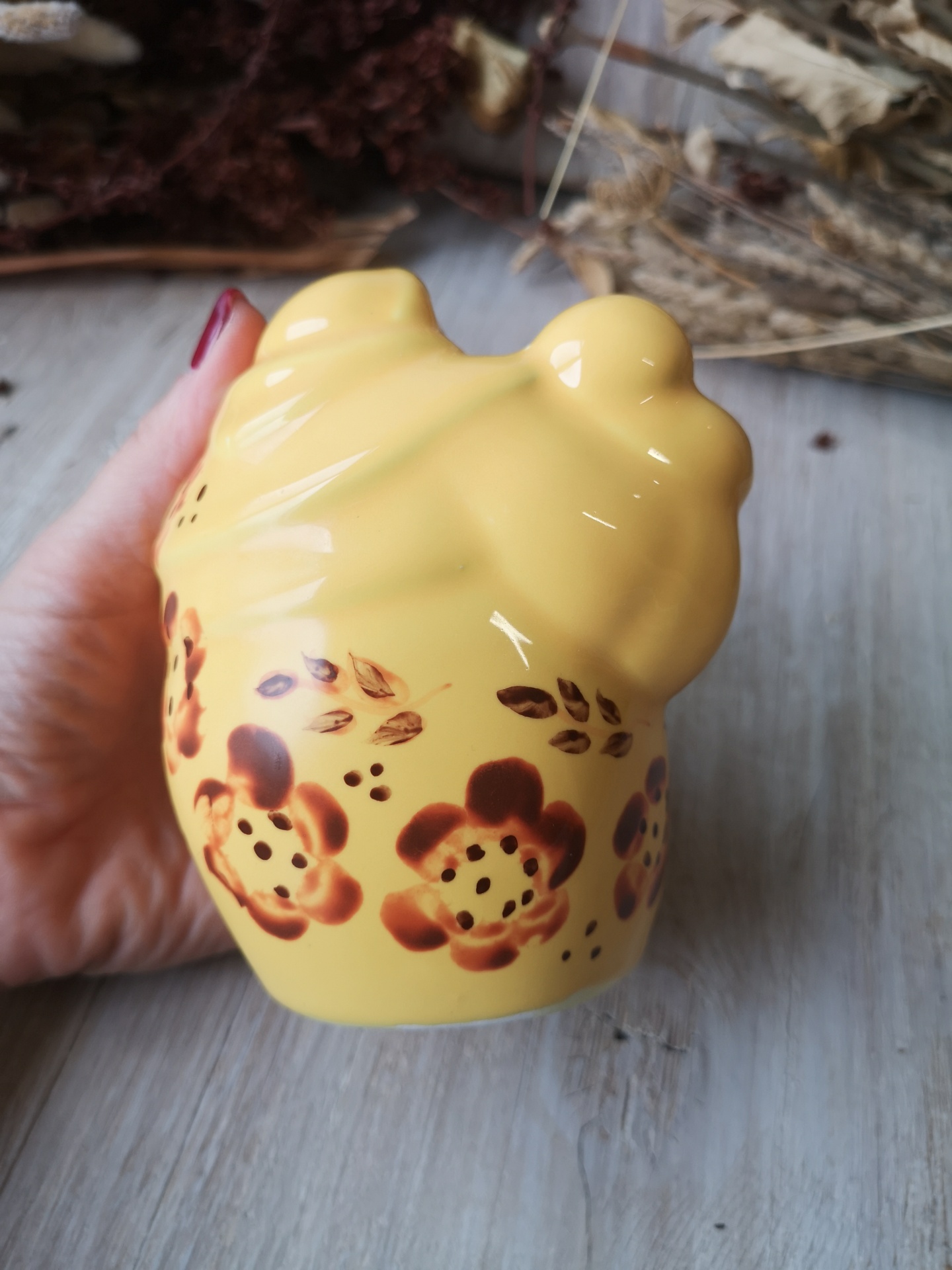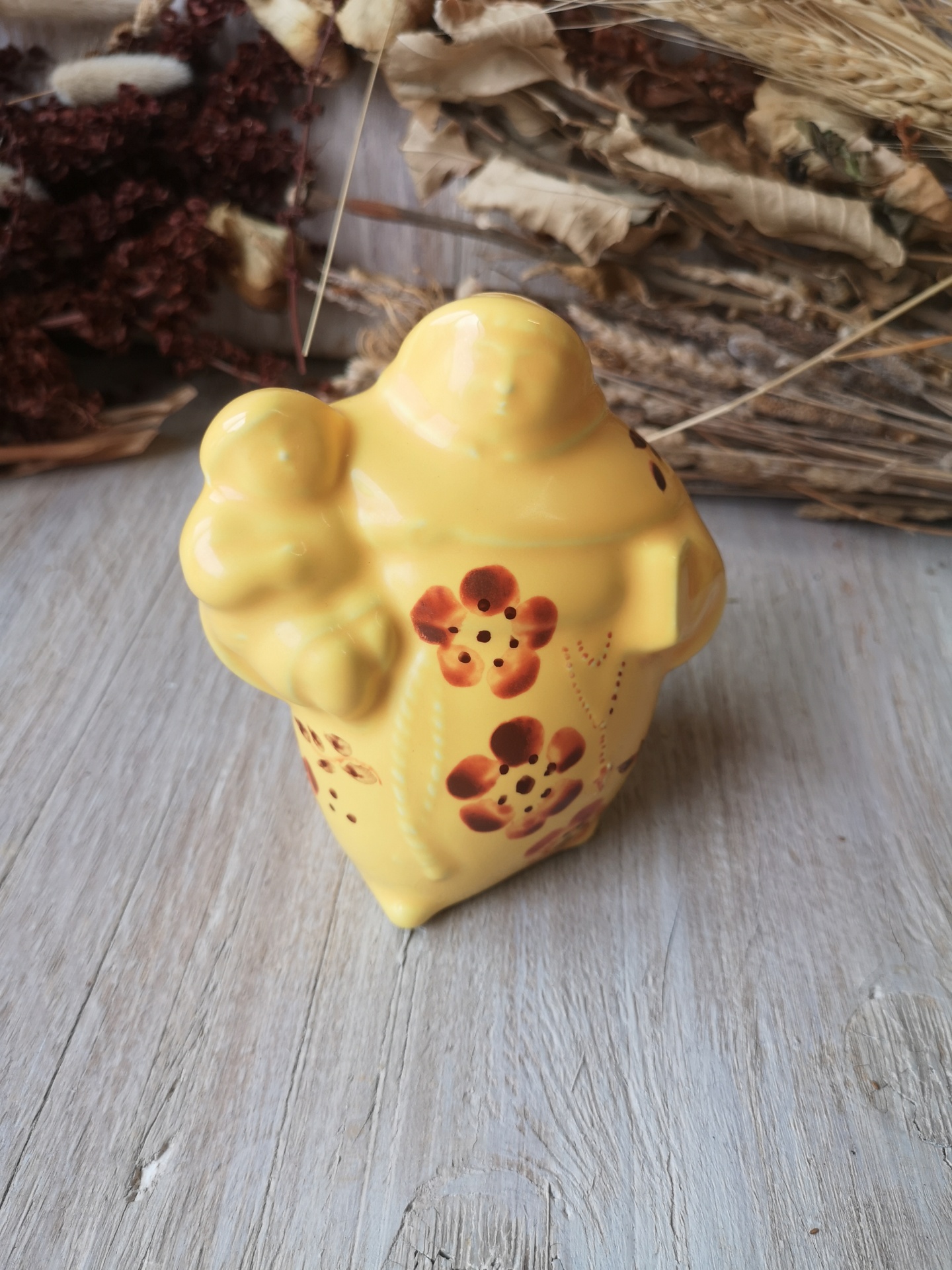 peça cerâmica amarela com flores pintadas e fundo de madeira e flores secas