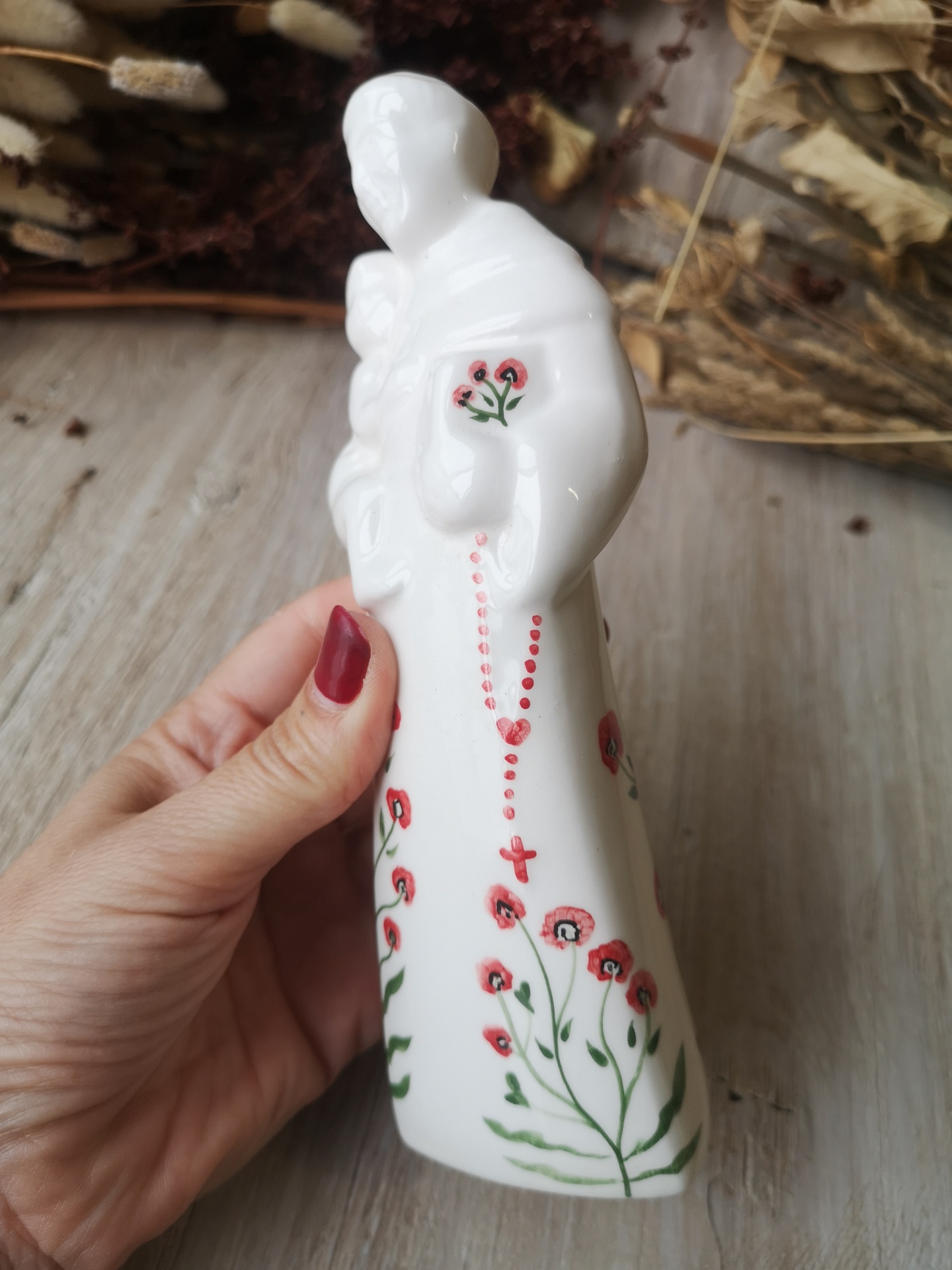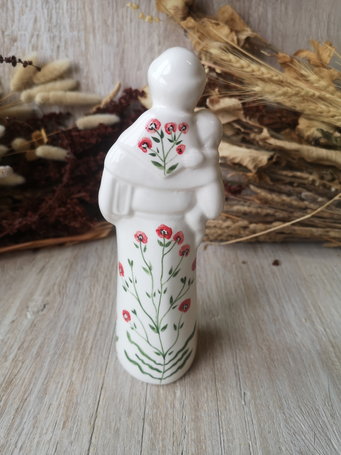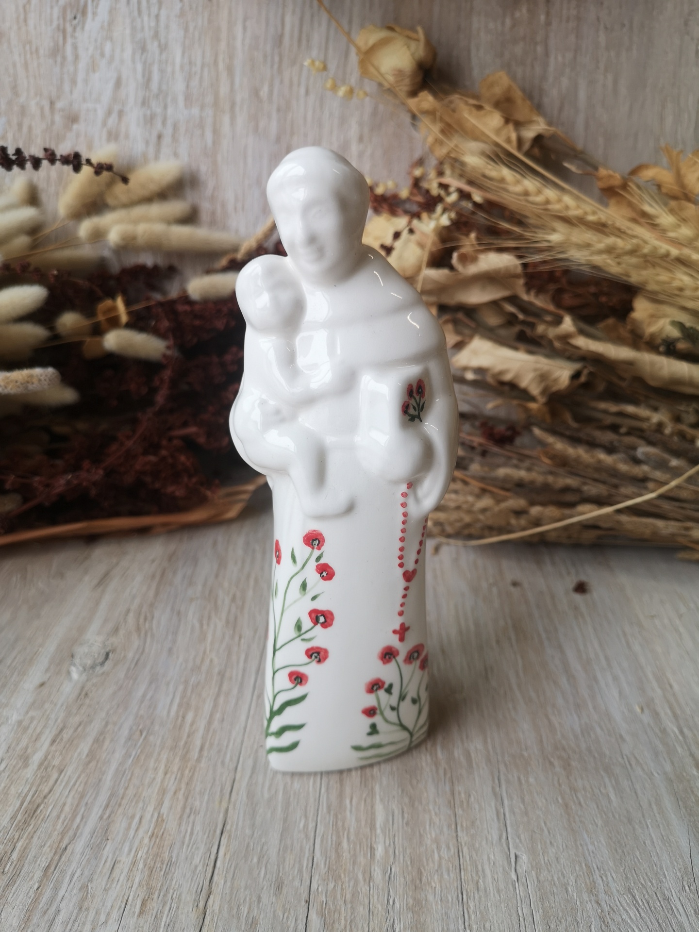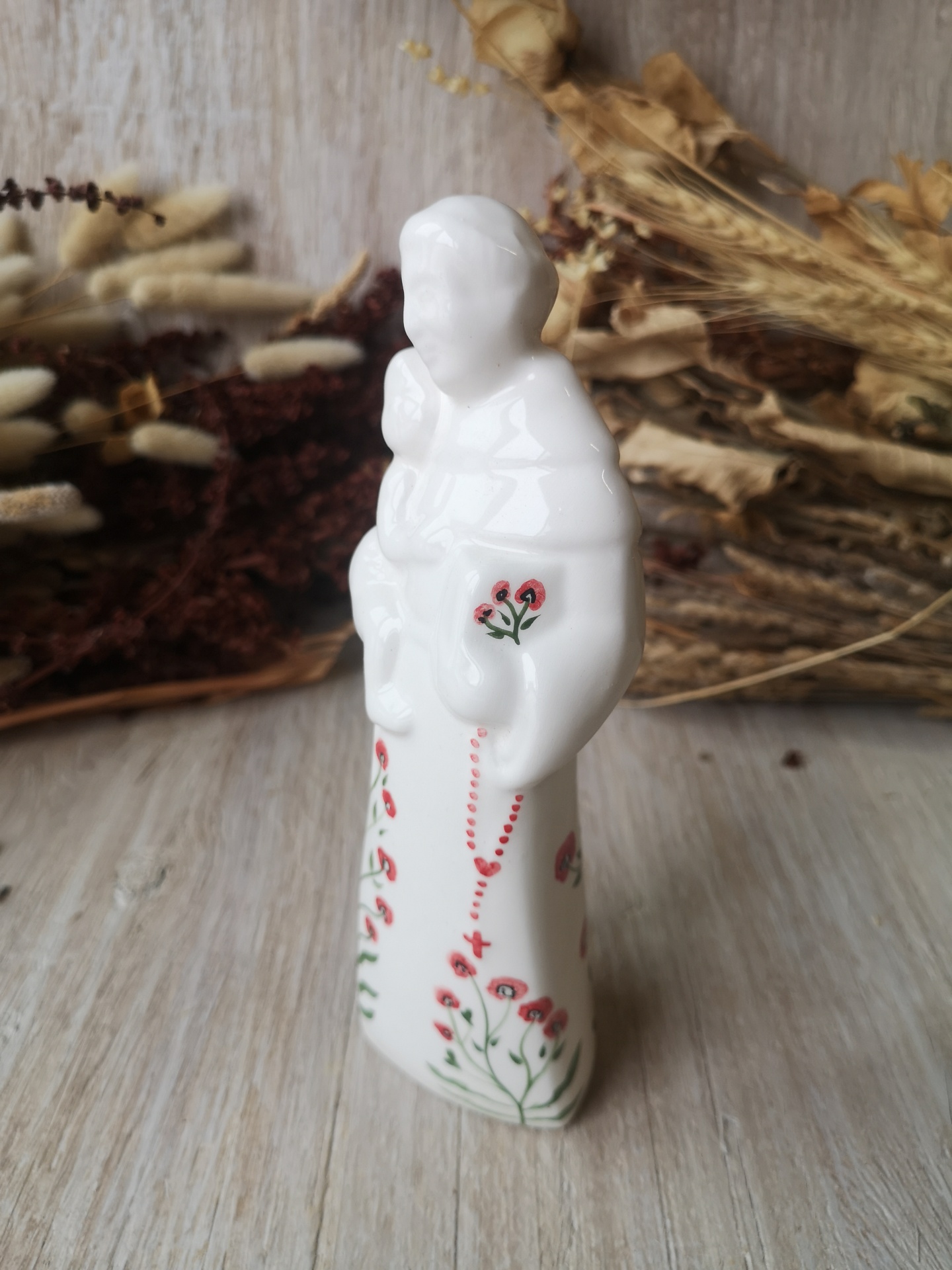 Figura de cerâmica branca com flores vermelhas e verdes, pessoa a segurar criança, sobre madeira clara com plantas secas