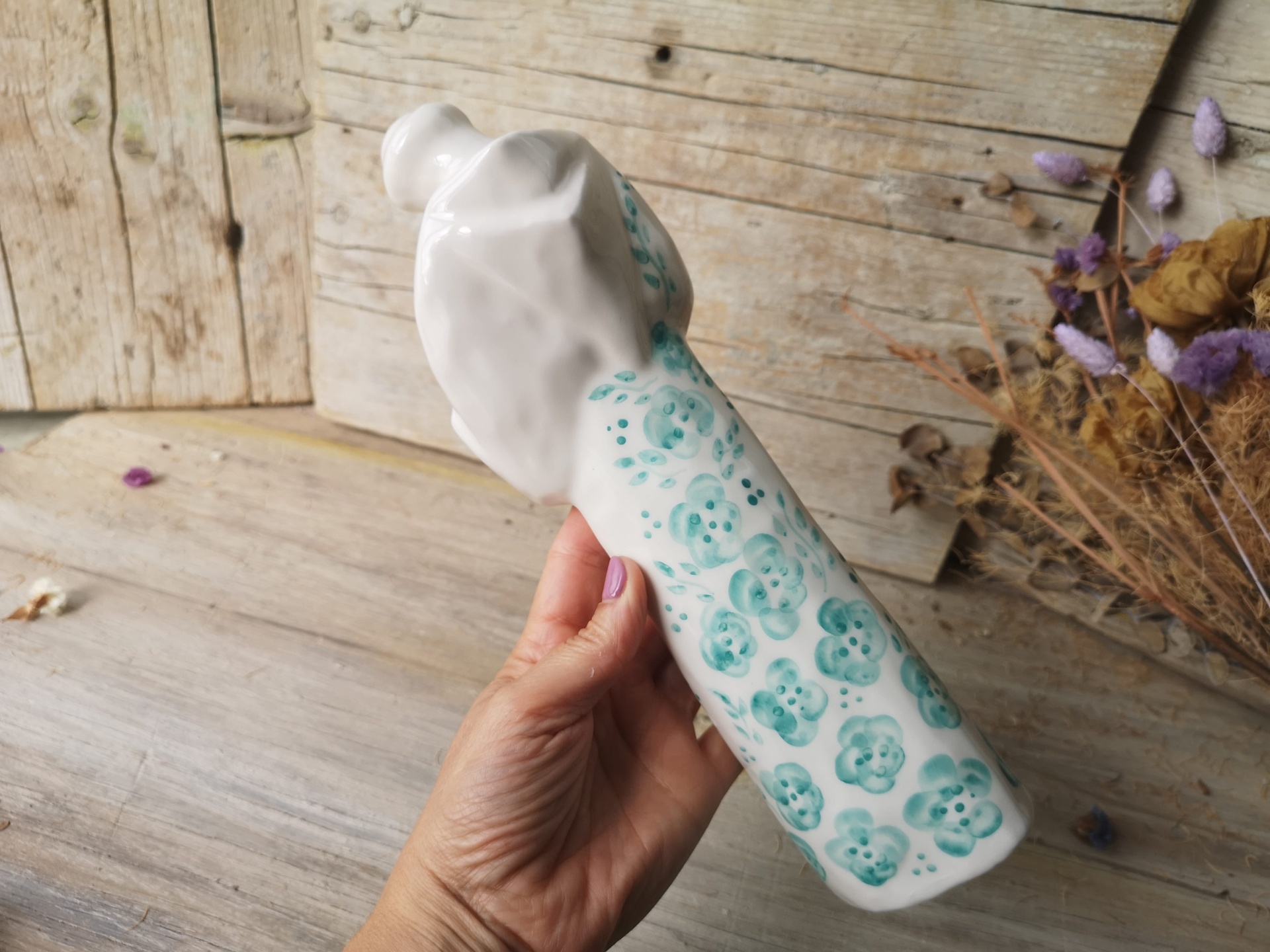 Estátua decorativa branca de cerâmica com detalhes verdes e azuis, sobre madeira clara com flores secas ao lado