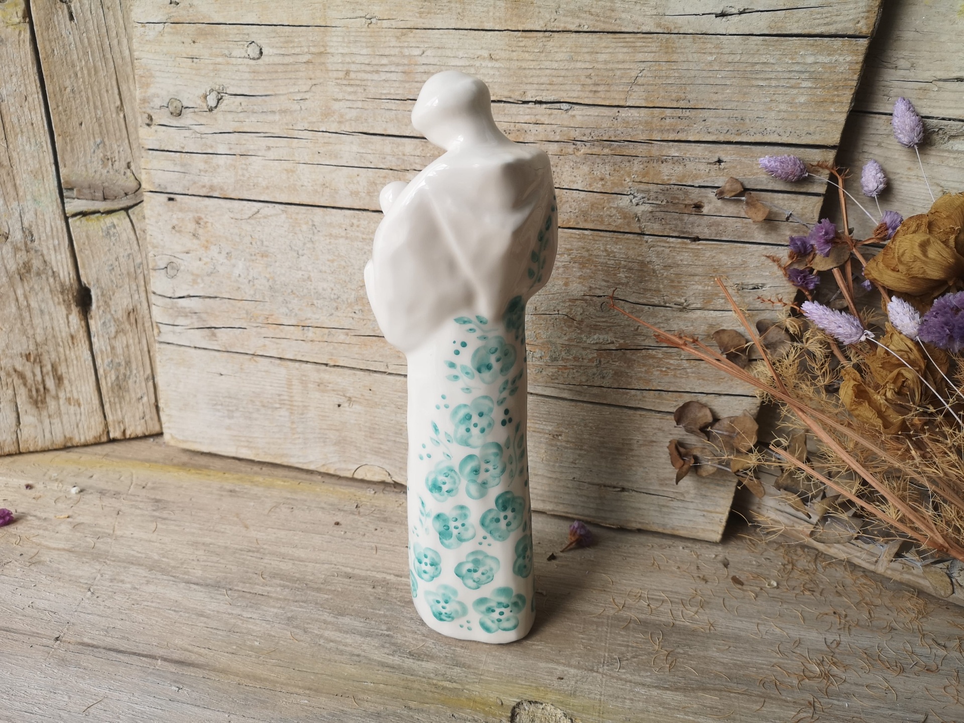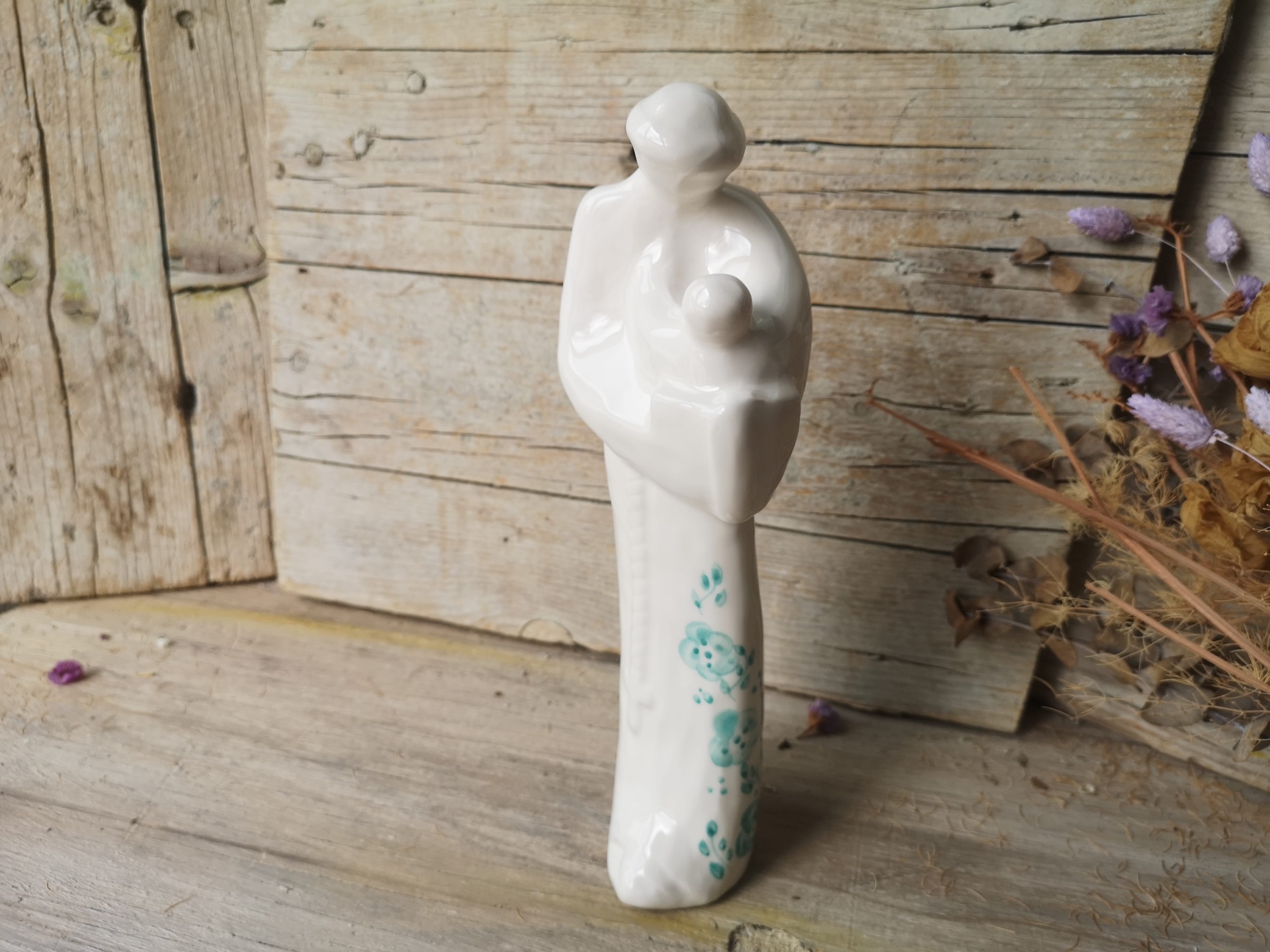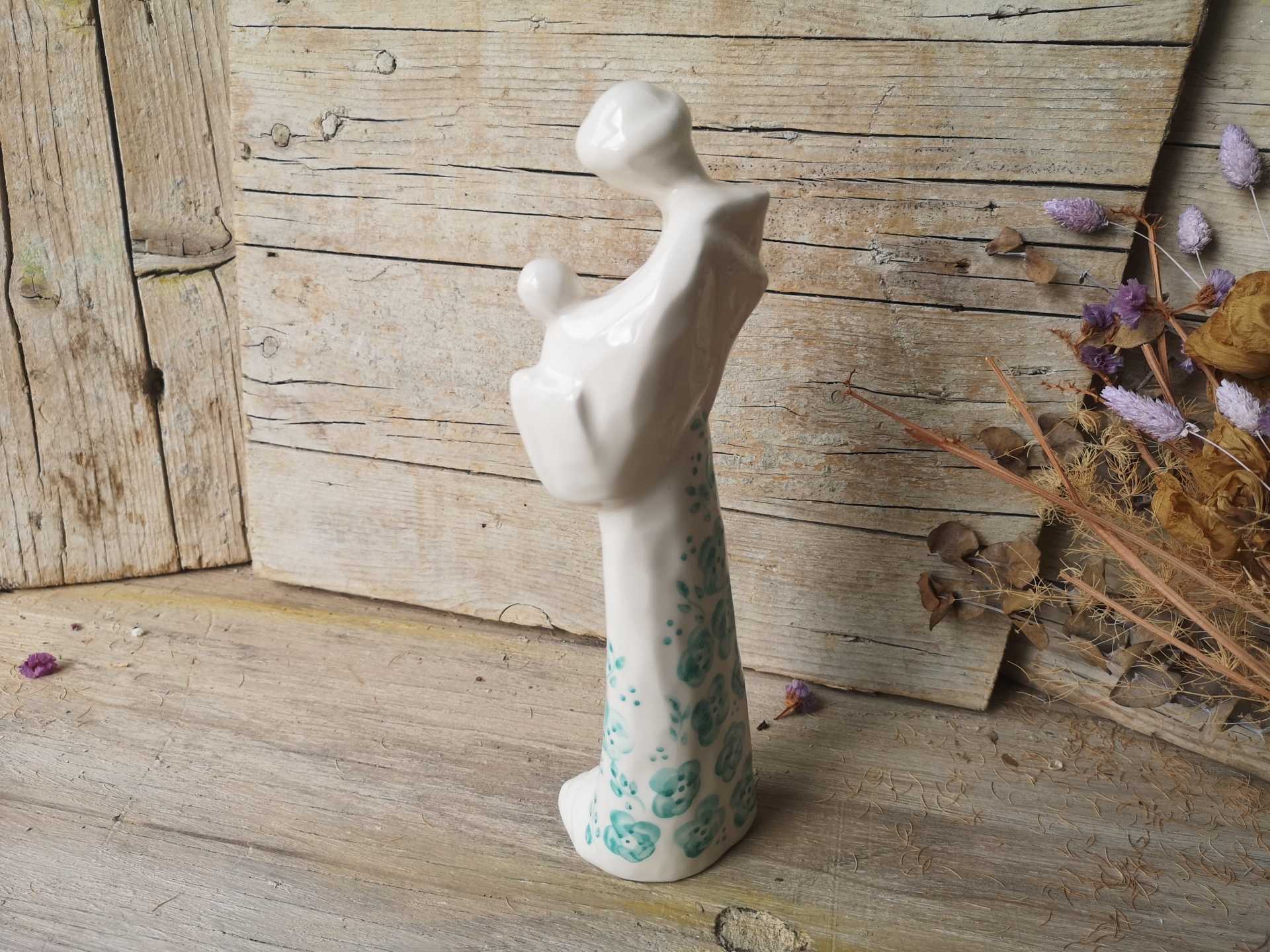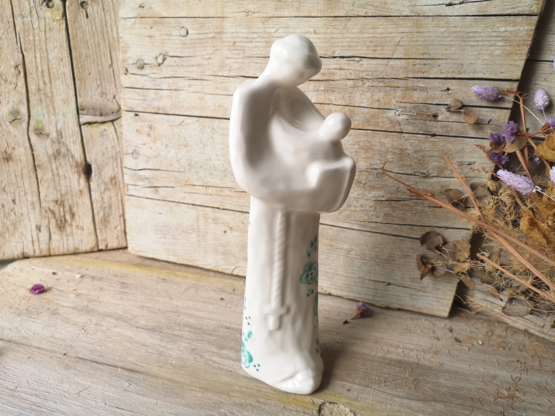 Figura decorativa de cerâmica branca com flores azuis e mulher segurando criança