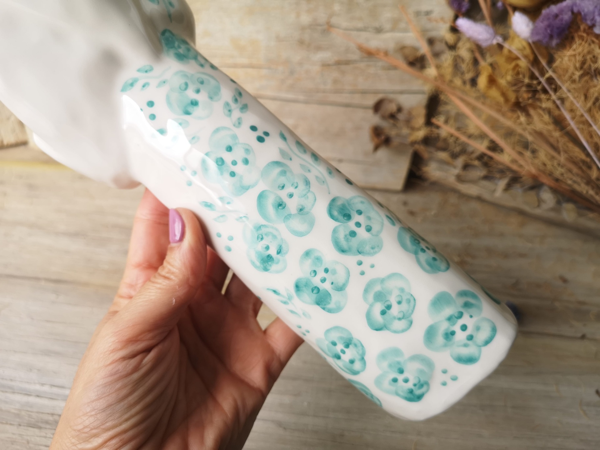 Frasco de cerâmica branco com flores verde-azuladas e fundo de madeira