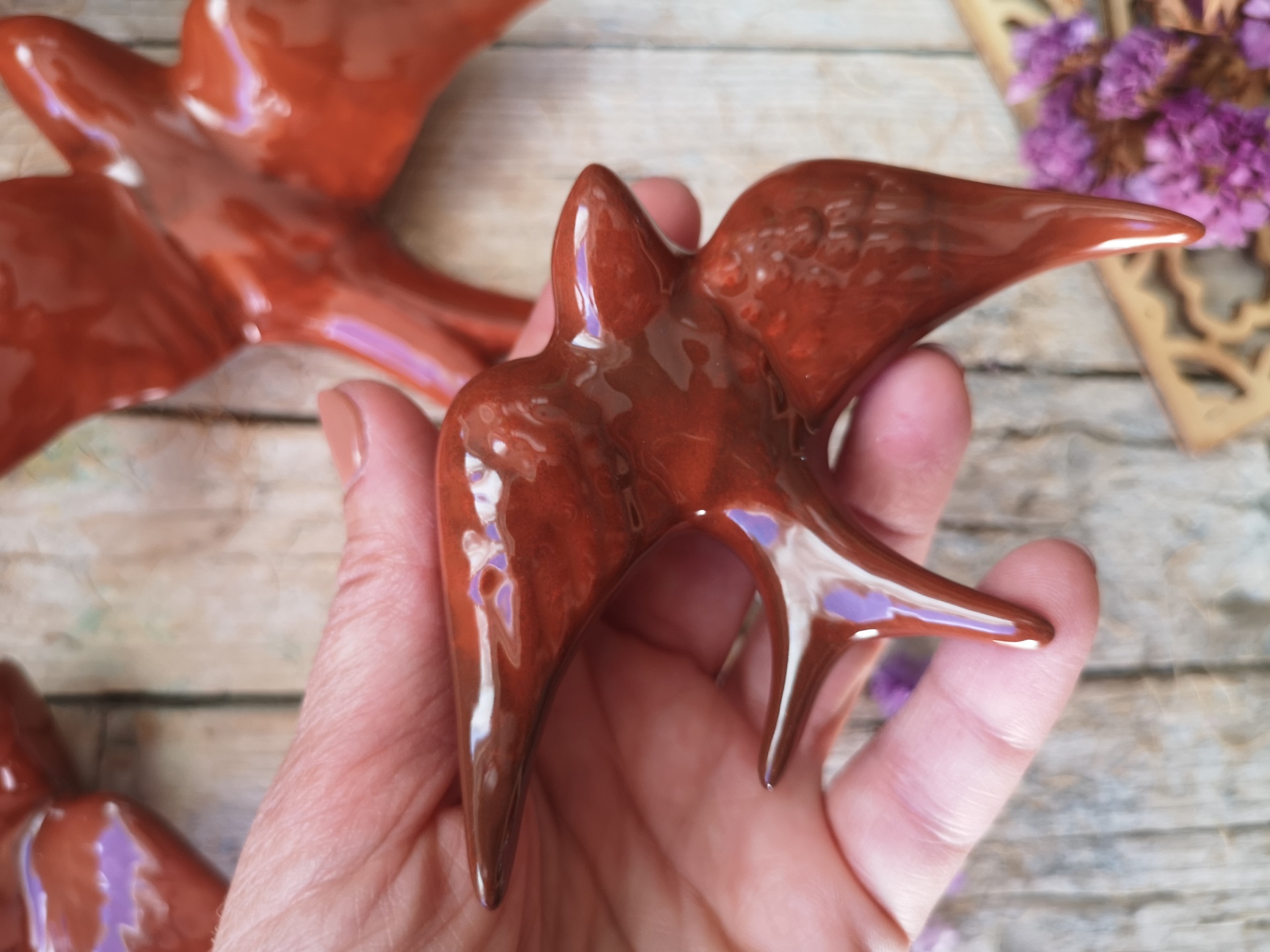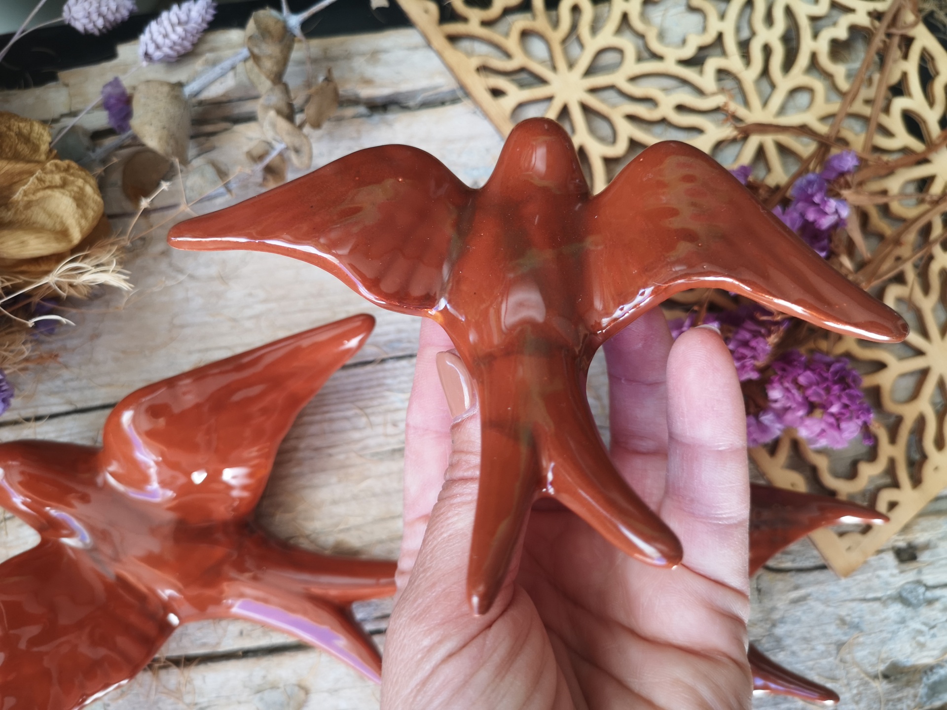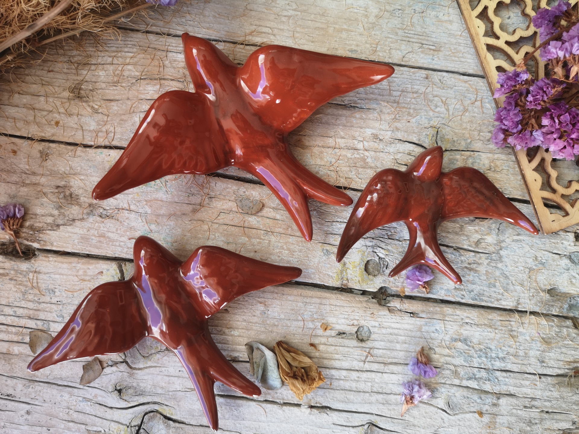 Conjunto de 3 andorinhas em cerâmica, cor Sienna. Este conjunto contém:
