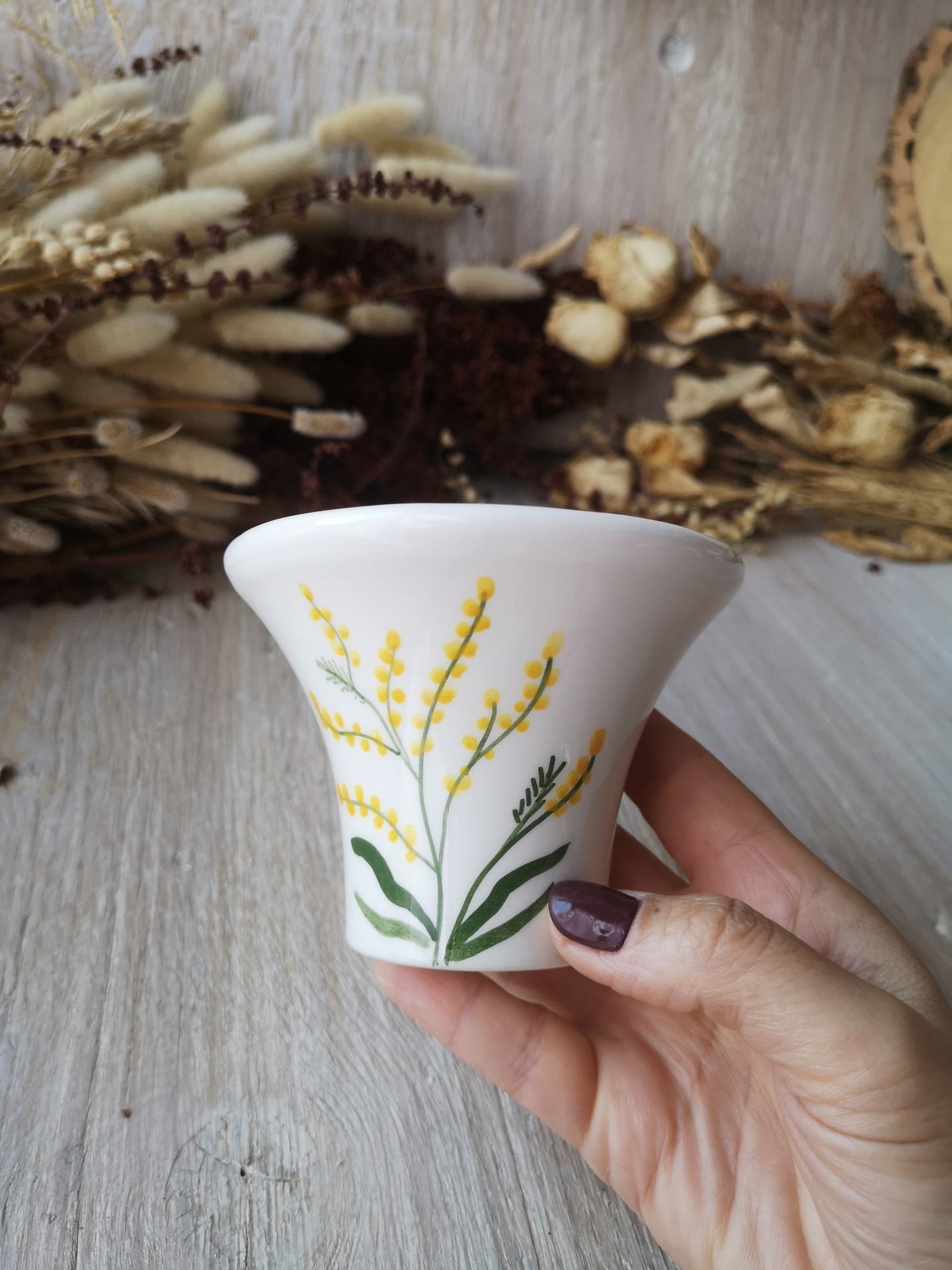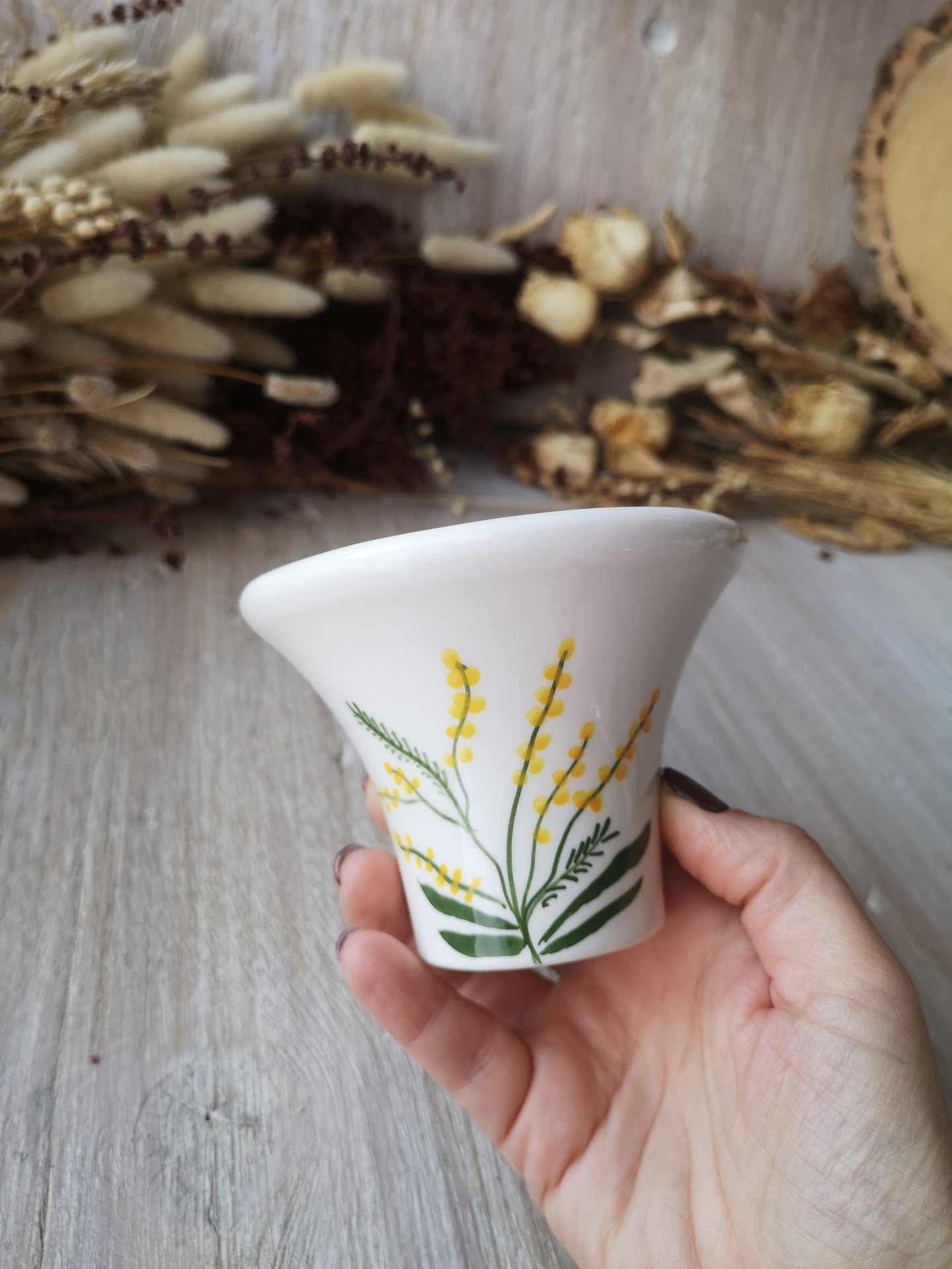 Vaso de cerâmica branco com desenho floral amarelo e verde numa mão