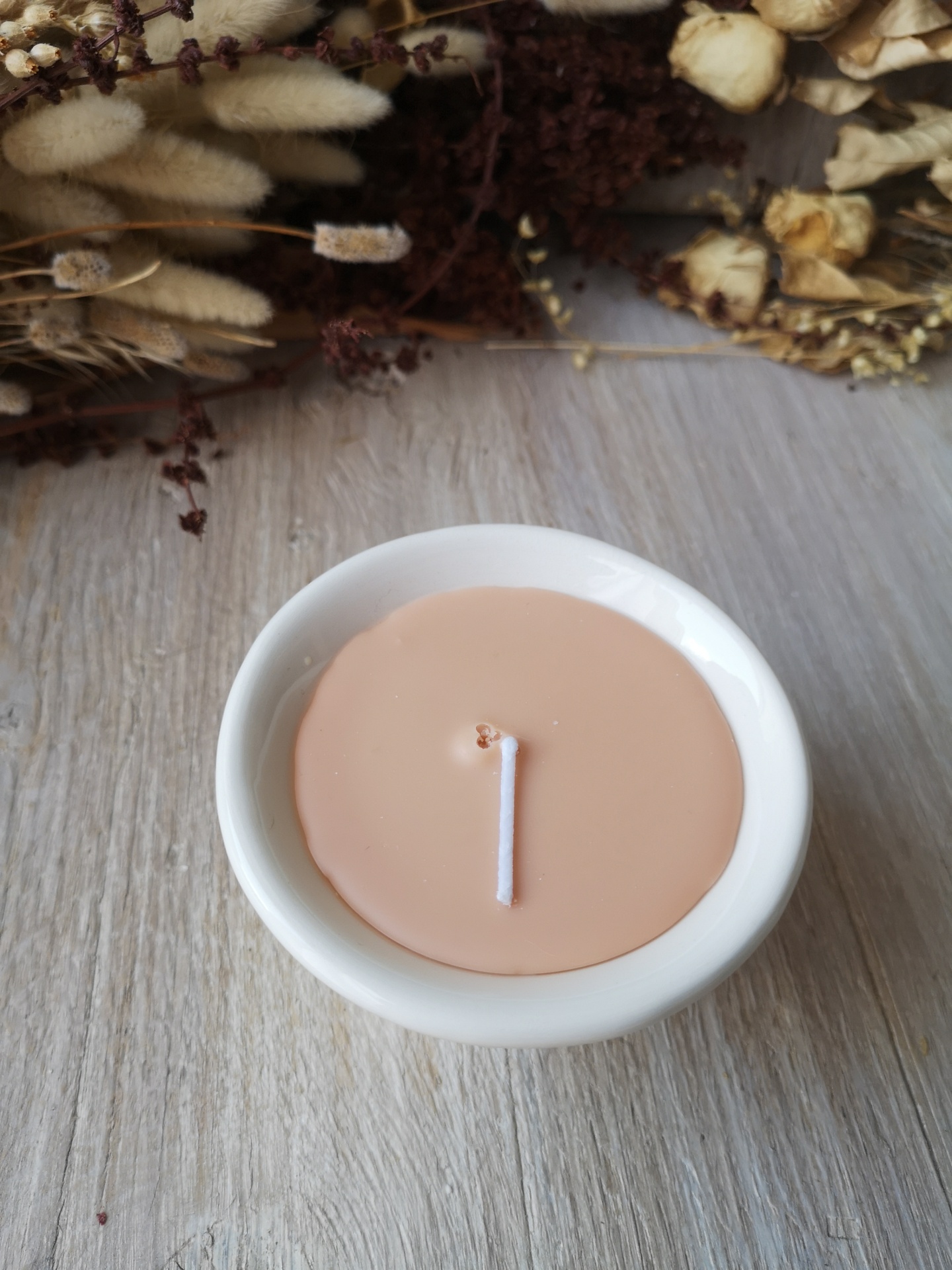 Vela castanha clara em recipiente branco com flores secas ao fundo