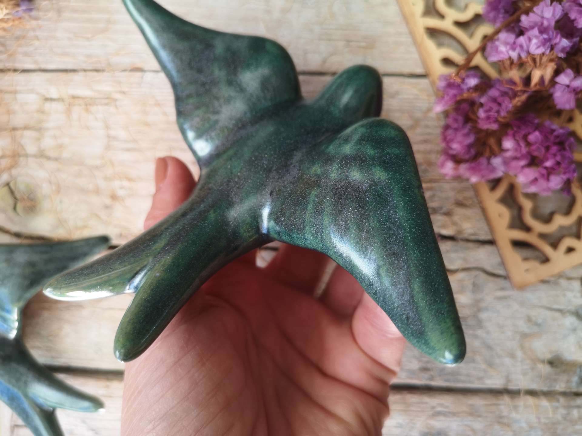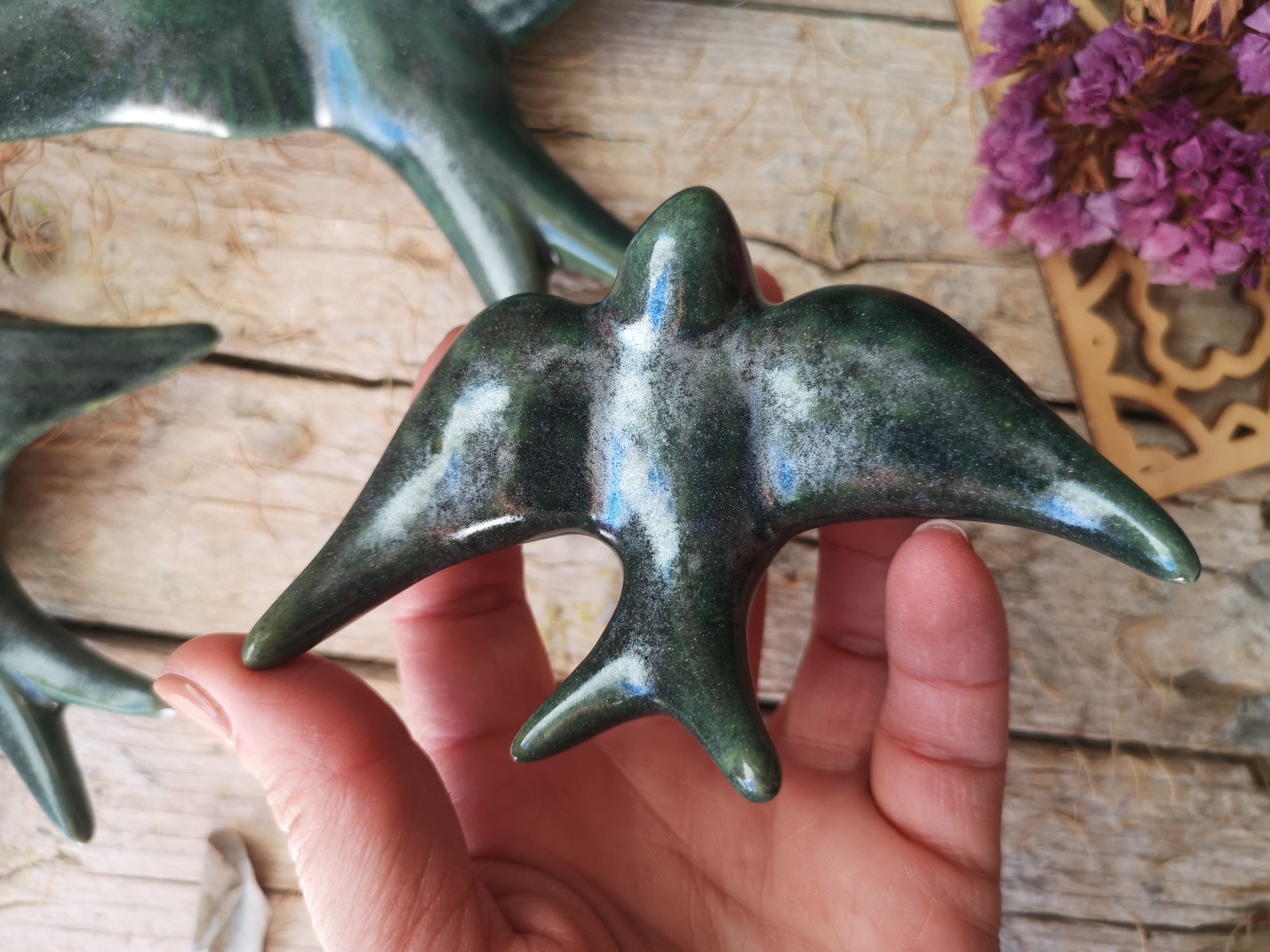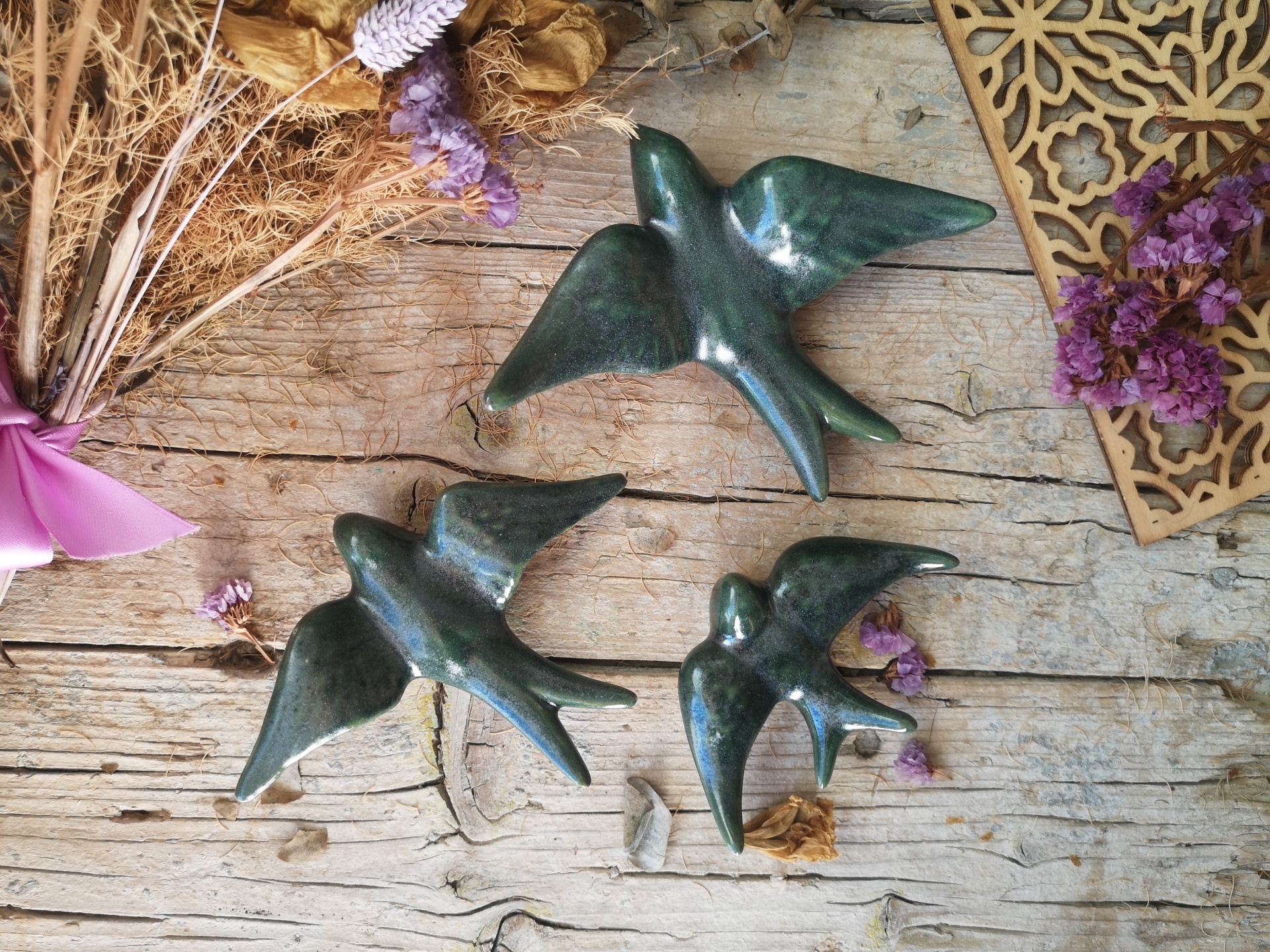 Conjunto de 3 andorinhas em cerâmica, cor verde Metálico